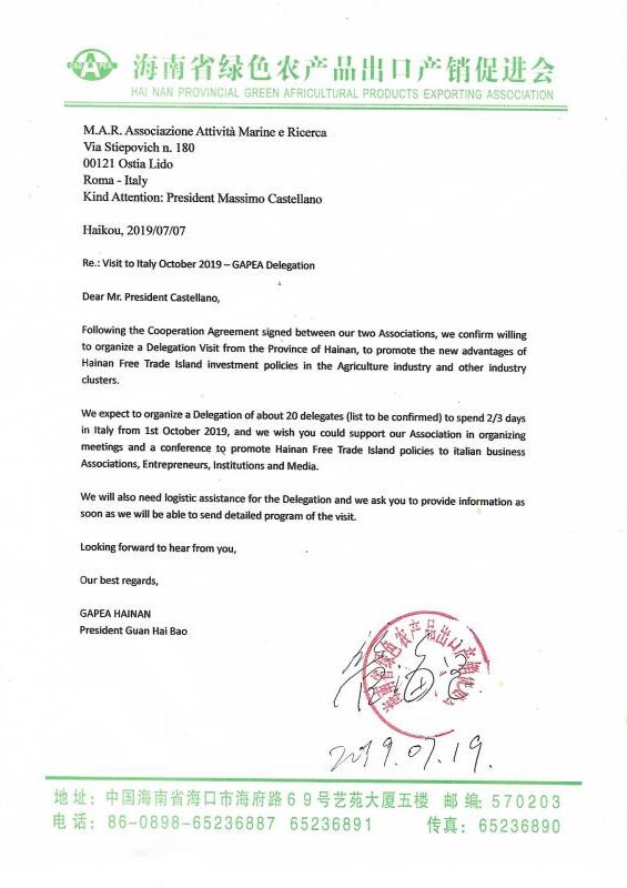 Mese di Luglio, Agosto, Settembre e Ottobre 2019. In previsione della visita della Delegazione della Associazione Cinese GAPEA (Associazione che include i principali attori del settore Agricolo e Acquacultura della Provincia cinese di Hainan), preparazione accordo inter-associativo, attività amministrativa per inviti ufficiali della Delegazione che include anche autorità della Provincia di Hainan (Dipartimento Agricoltura e Risorse Marine) prevista per i primi mesi del 2020. Visita conseguenza degli scambi avviati dalla Associazione nel 2017 con l’accompagnamento ad una visita nella Provincia di Hainan di una Delegazione dei Comuni Laziali di Fiumicino, Civitavecchia, Montalto di Castro e Rieti, stimolata dall’invito del Dipartimento degli Scambi Culturali della Provincia Cinese.